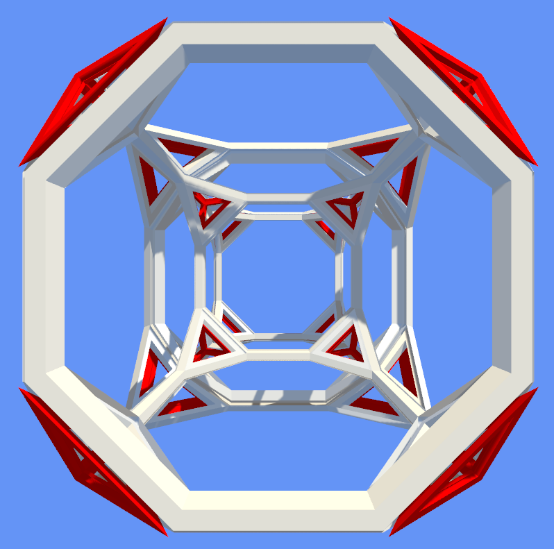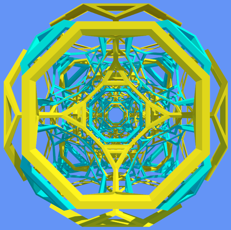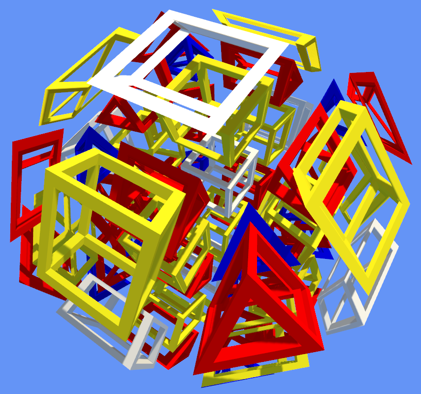 View 3D projections of uniform 4D polychora. For more information about these shapes, see the Wikipedia page Uniform 4-polytope. Use the dropdown at the top-right to choose a shape to view. The left toolbar allows choosing rotation speed and moving the camera, and the right toolbar allows choosing the color of different sets of cells (including none, allowing hiding certain sets of cells) or hiding cells depending on whether they face toward or away from the +W axis. The cell scale slider changes the size of cells and the projection slider varies from orthogonal to approximately-stereoscopic.